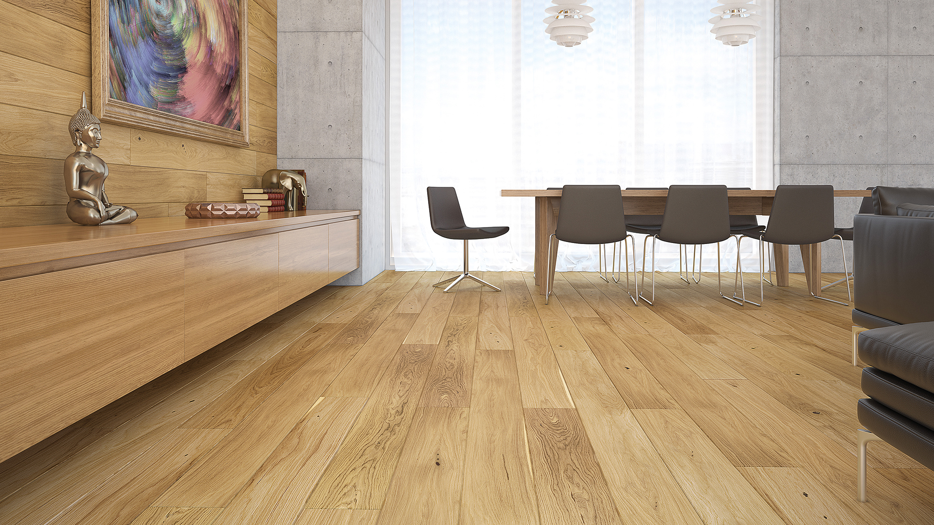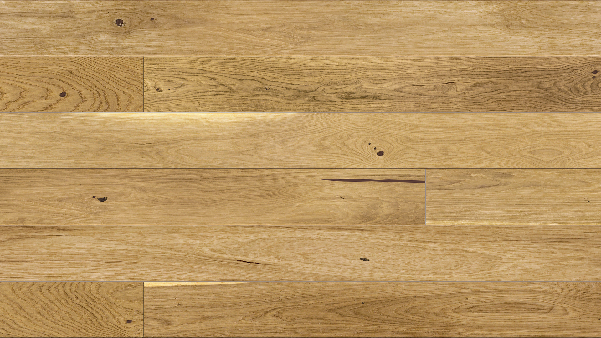 Parchet triplu stratificat din stejar cu un desen clar al lemnului, unde sunt prezente și unele noduri mici. Muchiile teșite delicat oferă un efect vizual de alungire.