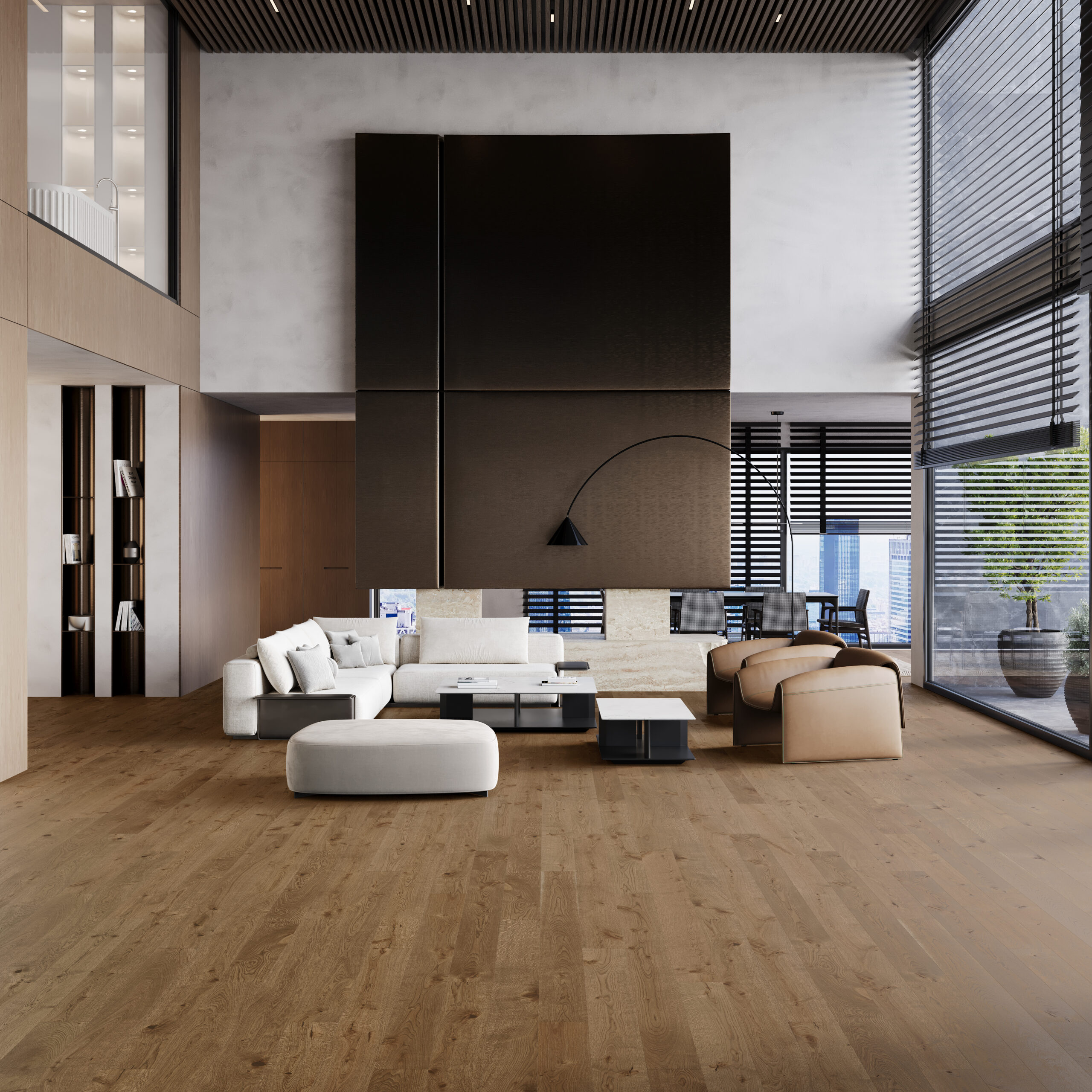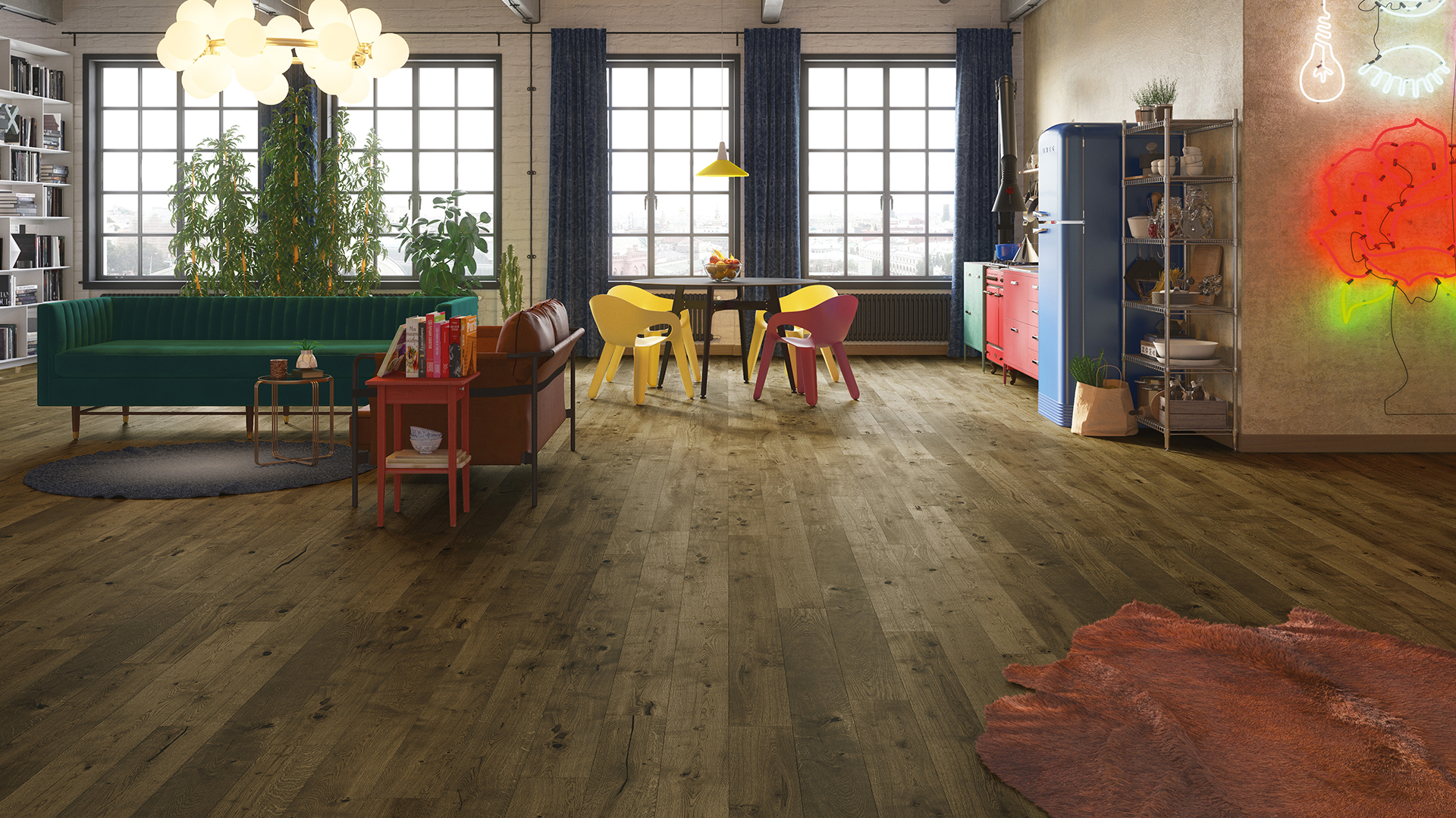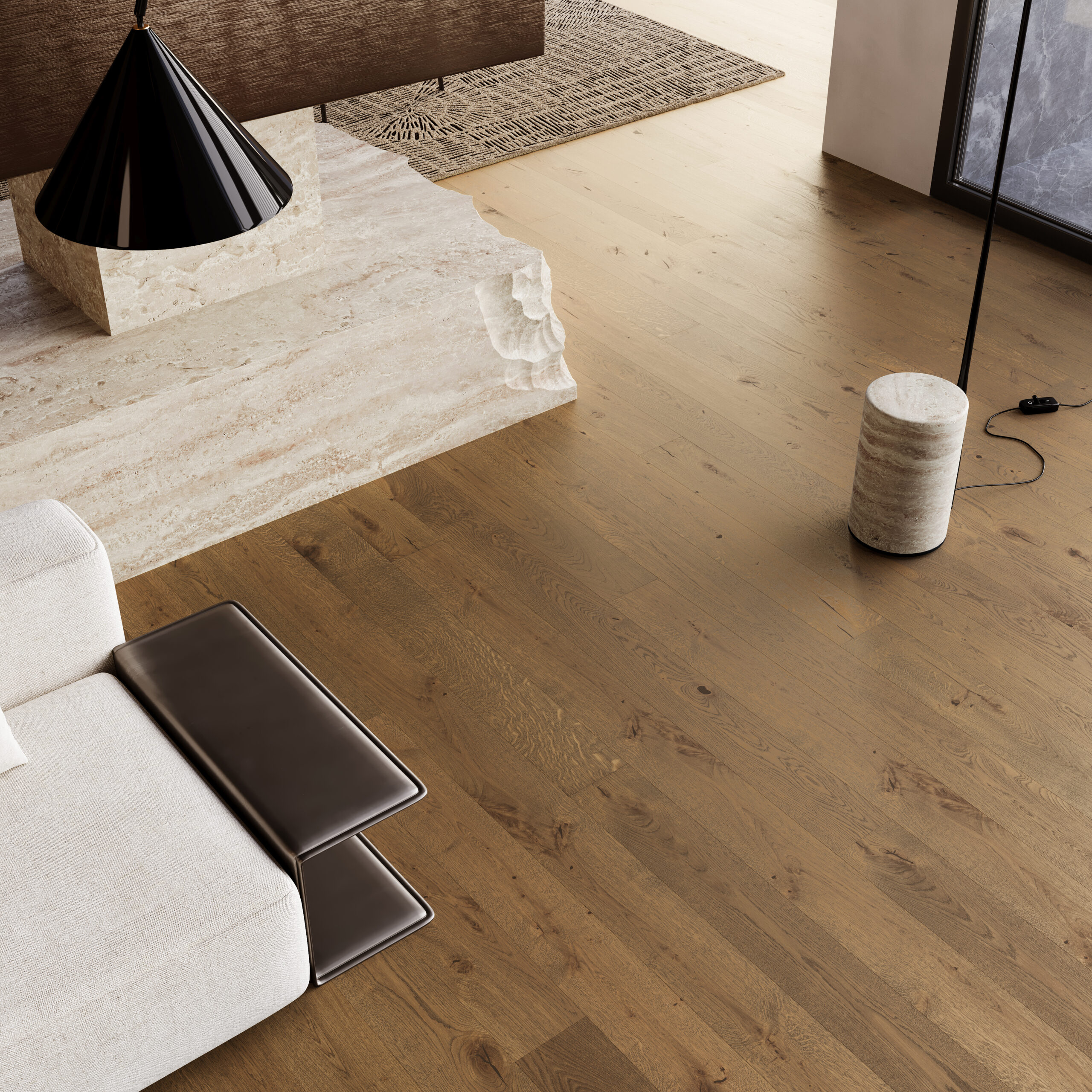 Pardoseală originală de culoare maro închis. Forma sofisticată a fost obținută datorită microfazei moderne pe 4 laturi, care se armonizează cu o gamă largă de caracteristici naturale ale lemnului finisată cu un lac mat.