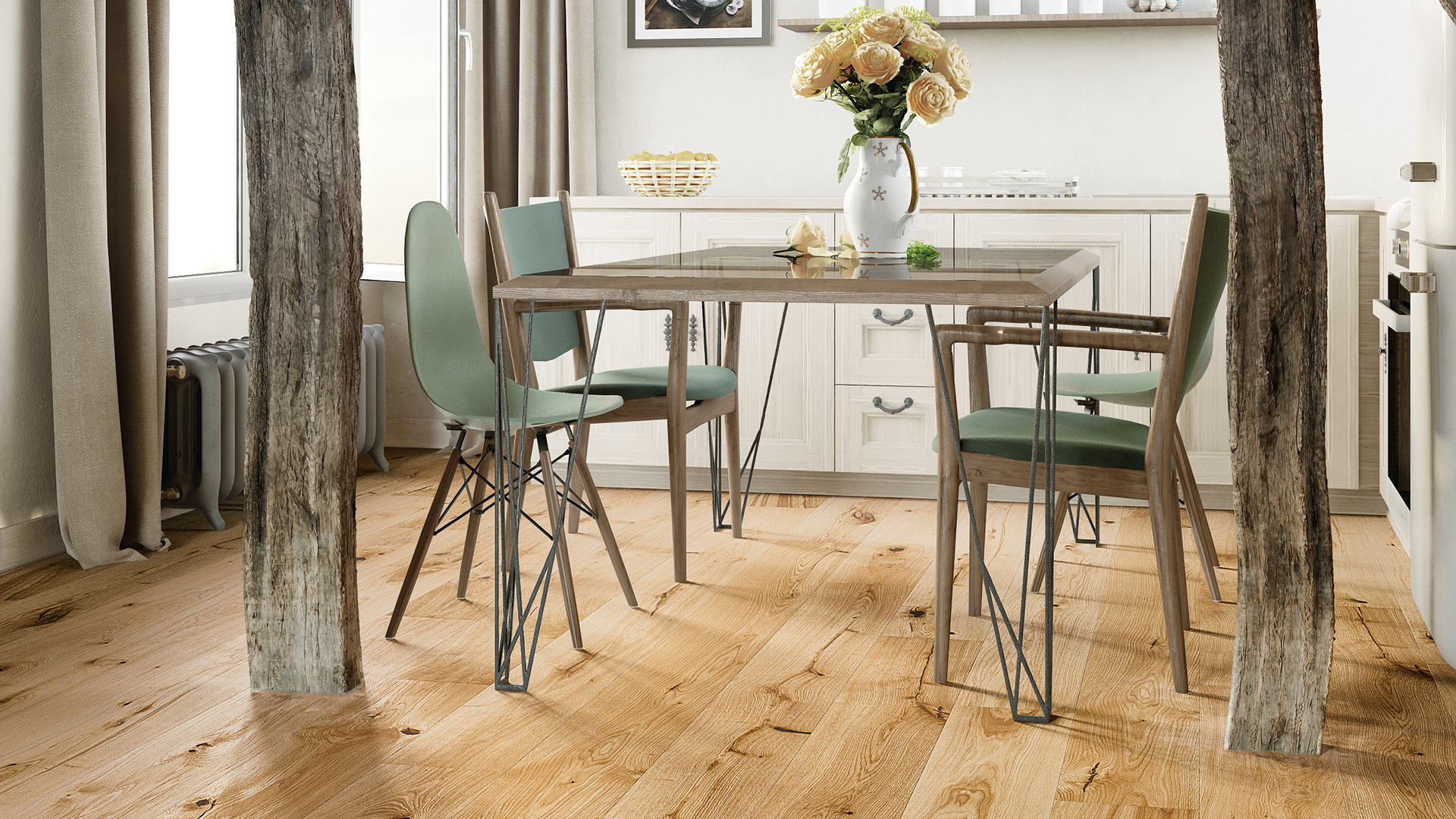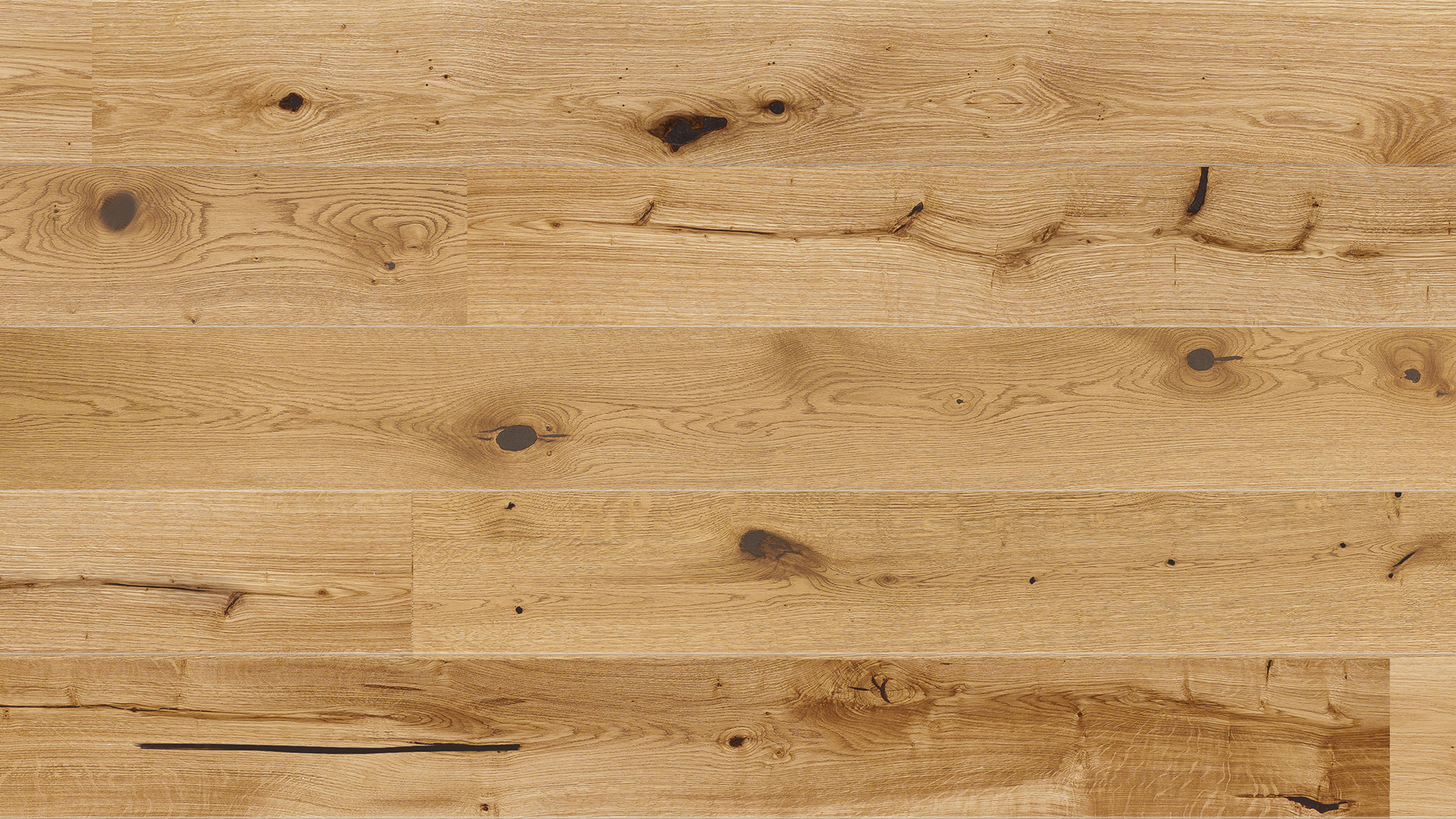 Podea din stejar, cu o singură lamelă, având o lățime de 207 mm și o lungime de 2200 mm, într-o culoare caldă de maro, al cărei caracter este dat de desenul mai întunecat și bine accentuat al lemnului. Plăcile au fost subliniate prin teșire pe două laturi și periere, iar întreaga suprafață este protejată cu…