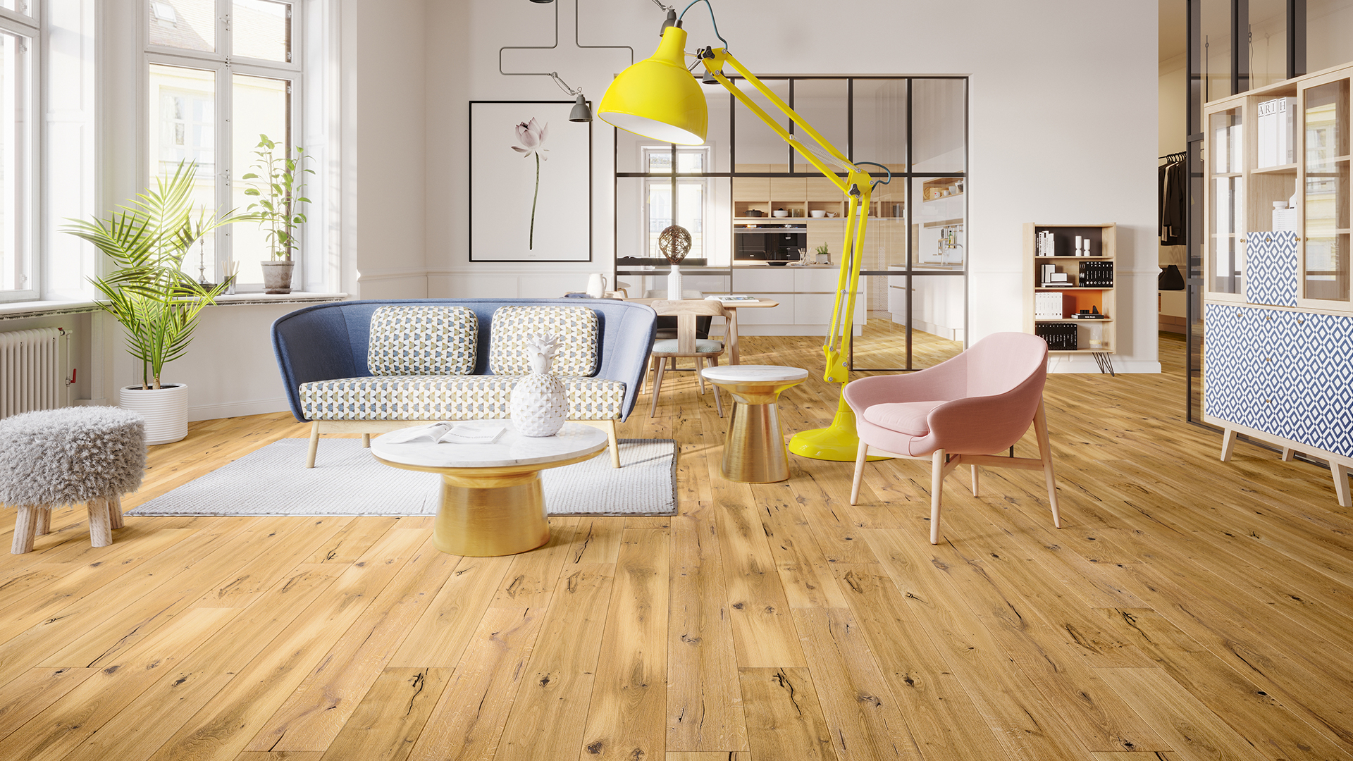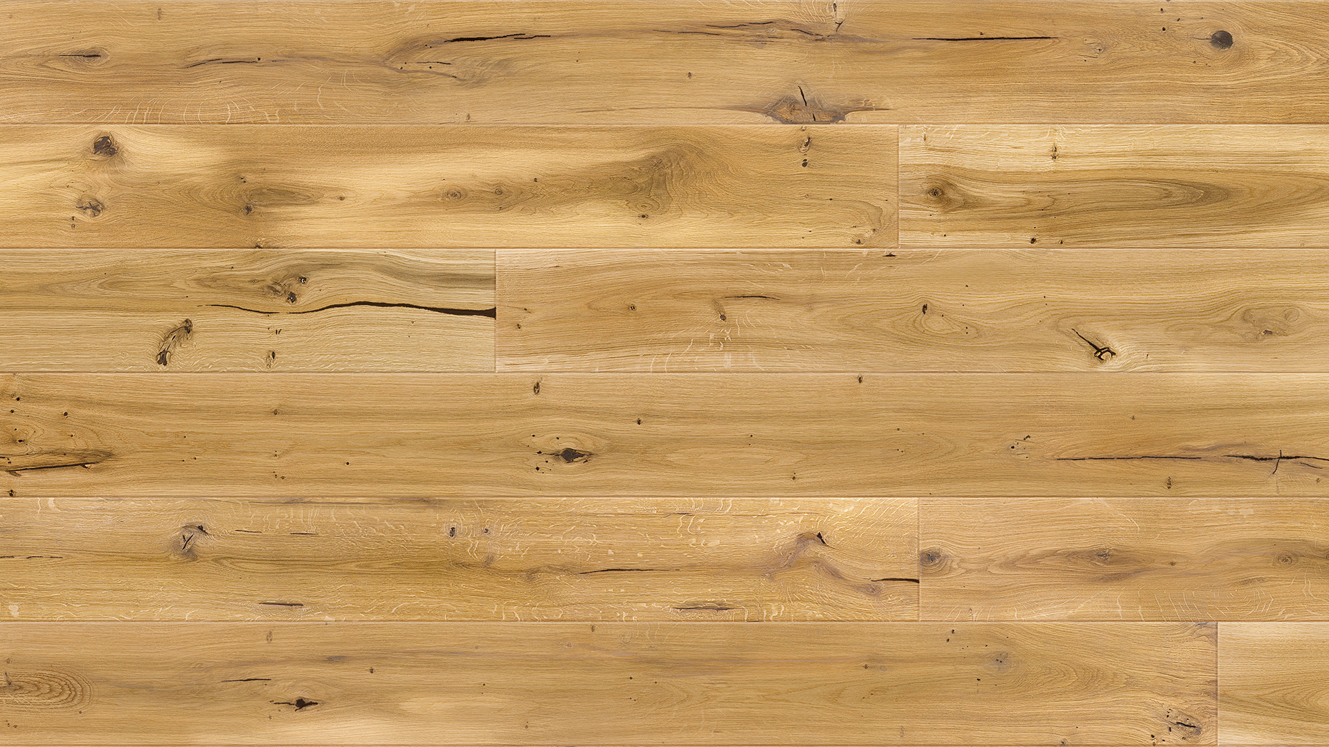 Un parchet cu un model distinct de lemn, subliniat prin periere. Suprafața plăcilor cu 1 lamelă este accentuata prin șanfrenare. Parchet finisat cu lac mat.