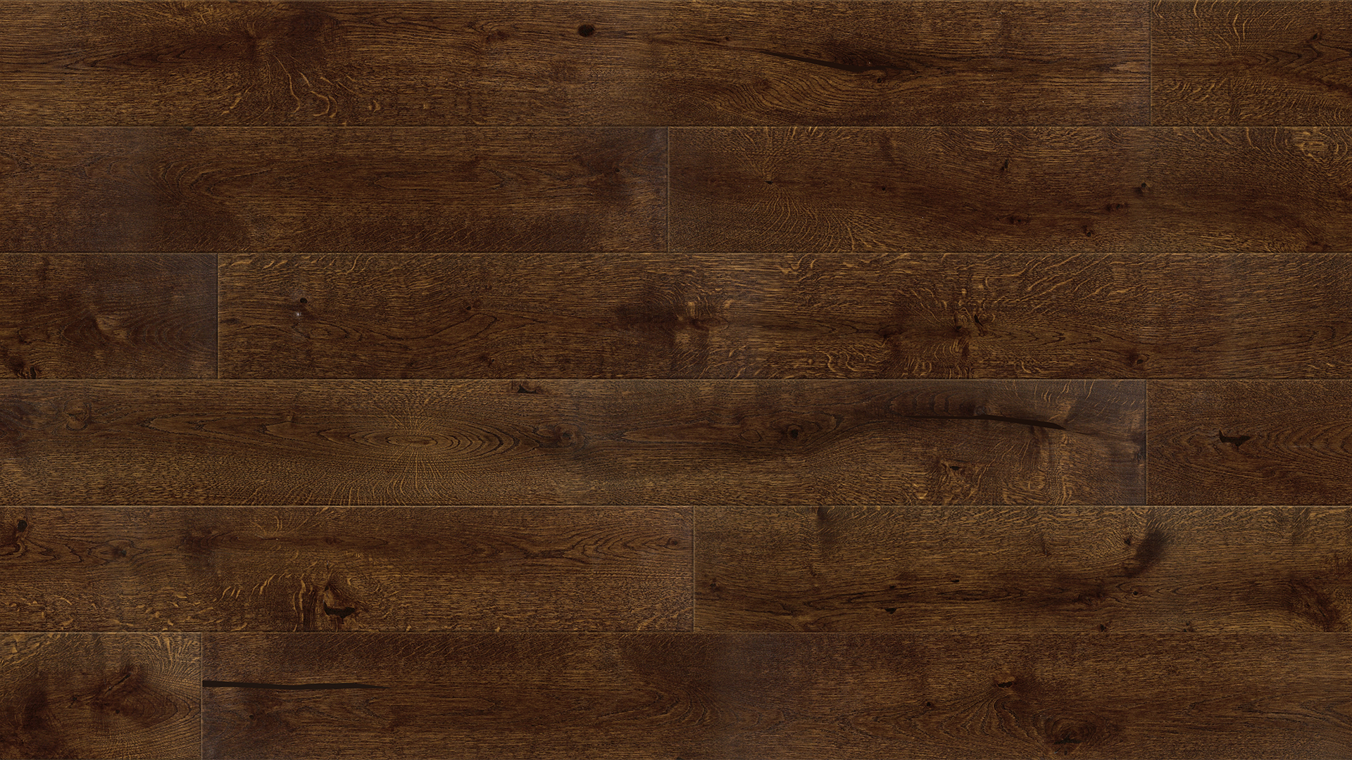 Parchet triplu stratificat din stejar cu o singură lamelă de culoarea stejarului afumat. Caracterul parchetului este subliniat prin periere și protejat cu lac mat.