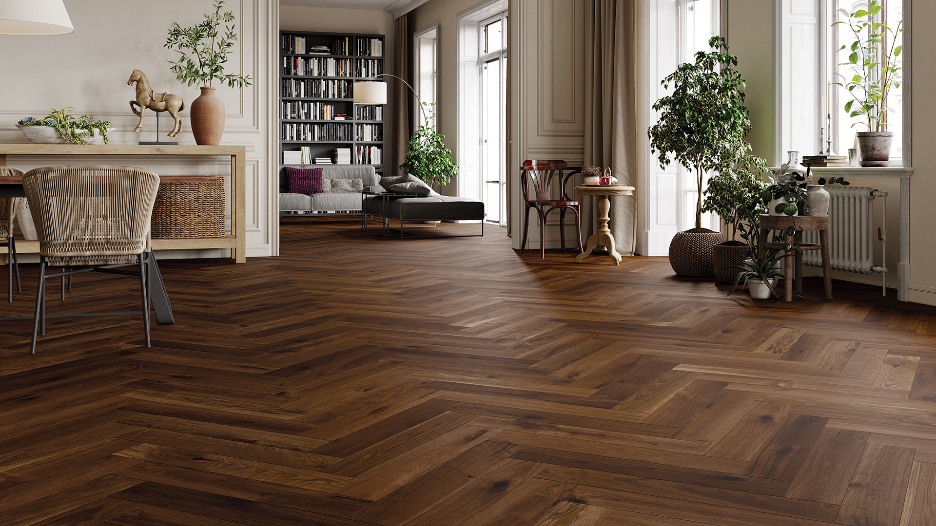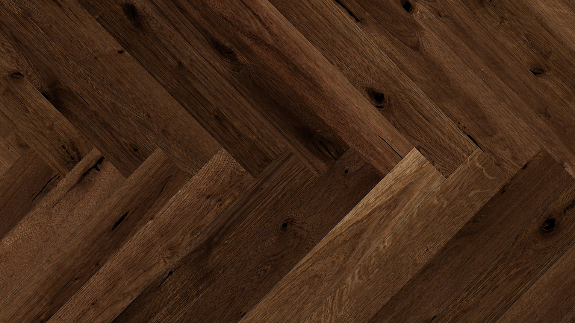 Pardoseală finisată cu o culoare intensă precum cea a ciocolatei negre, ce îi evidențiază caracteristicile unice. Lacul mat atenuează structura naturală a lemnului expus procesului de periere. Plăcile sunt evindențiate cu ajutorul canelurilor pe toate cele 4 laturi.