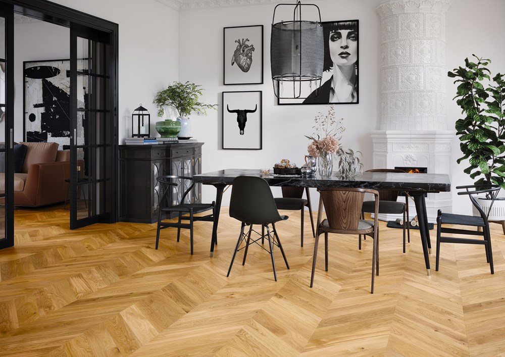 Stejar Chevron Vivid . Structura naturală a lemnului a fost subliniată prin periere și finisare cu ulei.