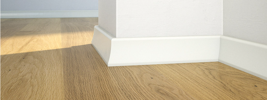 Plintă de pin cu folie albă. Este extrem de funcțională și stabilă dimensional. Se potrivește perfect cu orice tip de podea.