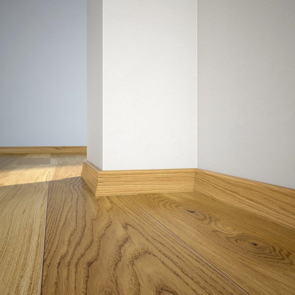 Plintă de pin cu furnir de stejar lacuită. Este extrem de funcțională și stabilă dimensional. Se potrivește perfect cu orice tip de podea.
