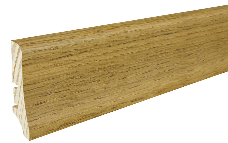 Plintă din lemn de pin stratificat îmbinat în dinți pentru a avea o stabilitate la lungime cu furnir de stejar lacuită.