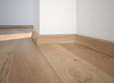 Plintă din lemn de pin  stratificat îmbinat în dinți pentru a avea o stabilitate la lungime cu furnir de stejar lacuită.