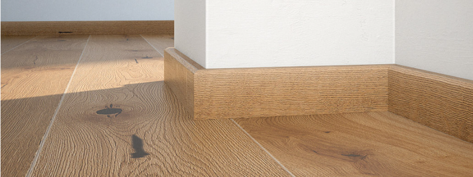 Plintă de pin cu furnir de stejar lacuită. Este extrem de funcțională și stabilă dimensional. Se potrivește perfect cu orice tip de podea.