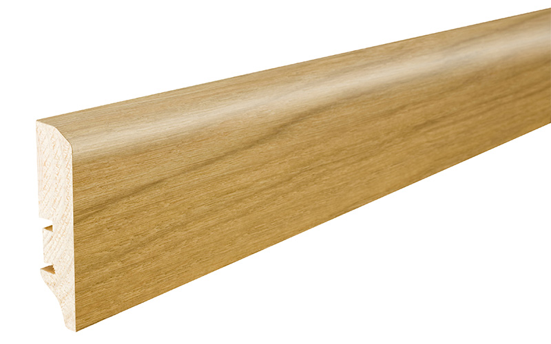 Plintă din lemn de pin  stratificat îmbinat în dinți pentru a avea o stabilitate la lungime cu furnir de stejar lacuită.