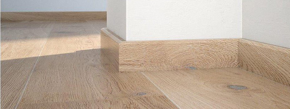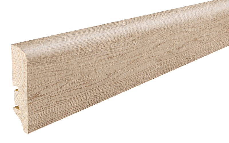 Plintă de pin cu furnir de stejar lacuită. Este extrem de funcțională și stabilă dimensional. Se potrivește perfect cu orice tip de podea.