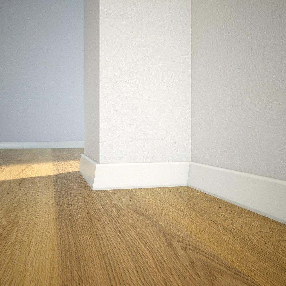 Plintă din lemn de pin  stratificat îmbinat în dinți pentru a avea o stabilitate la lungime vopsită albă și lăcuită.