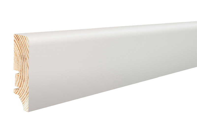 Plintă din lemn de pin stratificat îmbinat în dinți pentru a avea o stabilitate la lungime, este infoliată cu folie albă.