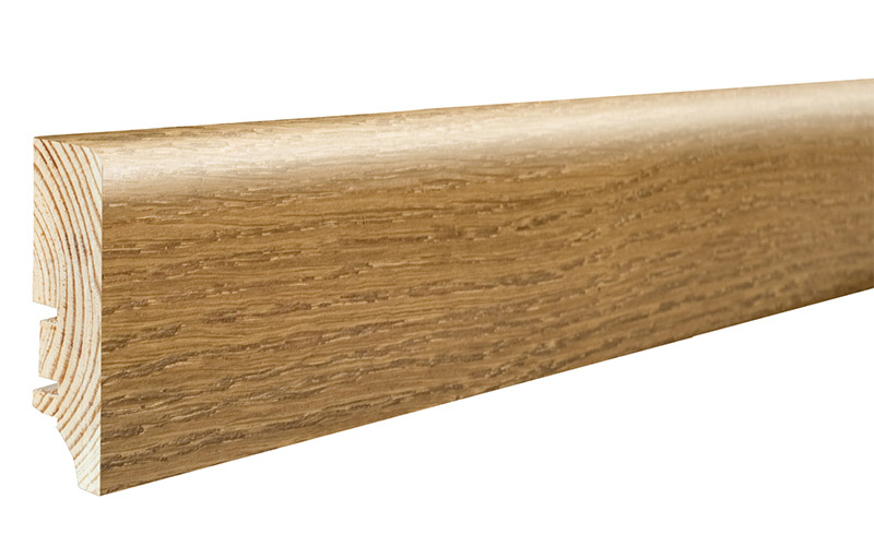 Plintă din lemn de pin stratificat îmbinat în dinți pentru a avea o stabilitate la lungime, este finisata cu furnir de stejar lăcuit.