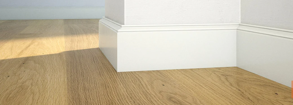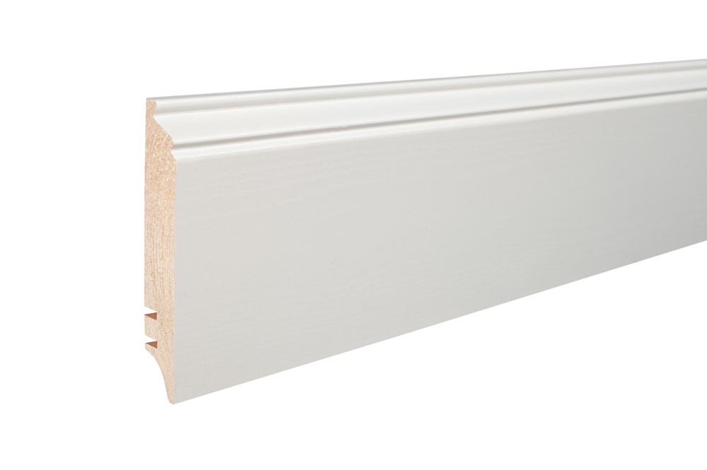 Plintă din lemn de pin  stratificat îmbinat în dinți pentru a avea o stabilitate la lungime vopsită albă și lăcuită.